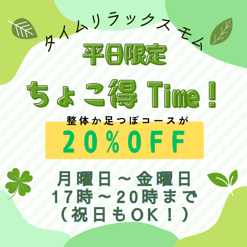 整体又は足ツボの30分コースから~20%引き致します。