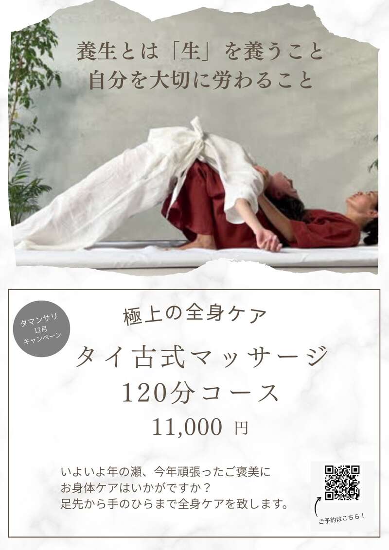 ユネスコ無形文化遺産に指定されたタイ古式マッサージと台湾式リフレクソロジーを組み合わせた全身ケアです